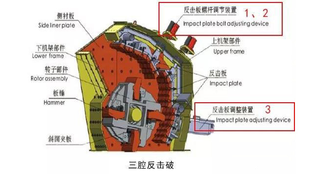 調整反擊架與轉子架之間的間隙可達到改變物料出料粒度和形狀的目的。、二反擊板通過頂部螺桿調節裝置,若存在第三塊反擊板(歐版反擊破),則通過墊片調節。