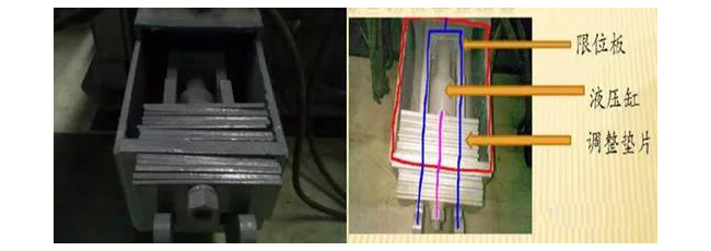以調小間距為例:先松開調整墊片的固定螺釘,然后液壓缸動作,推動里面的彈簧,使反擊板與轉子的間距變小,將外面的墊片裝到里面,接著松開液壓缸,直至限位板卡著里面的墊片。