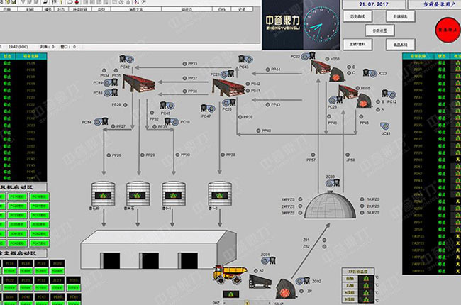 通過中控系統可以實現礦山設備的一鍵開關及單獨控制,通過傳感器等自動采集設備運行狀體及工作情況,如軸承溫度、設備工作電流、電壓、速度等狀態監測,對電量、產量統計。實現各級設備及各環節的集中控制及管控。
