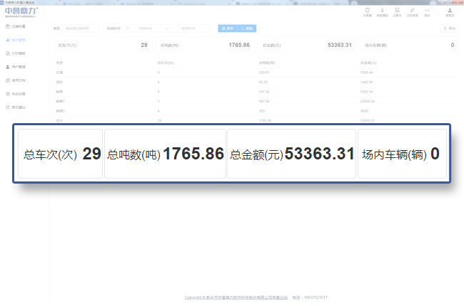 對過磅類型、特點時間段或全部時間段的車次、噸數、金額等進行匯總,并可以直接導出報表;