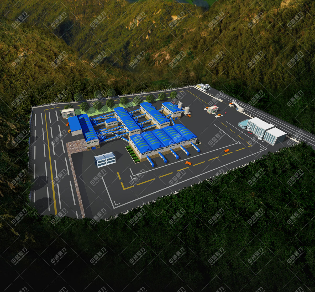 工藝流程:該項目為兩條生產線同時生產,大塊石料經一臺振動給料機ZGC2050均勻、連續的給到一臺重型錘式破碎機PCZ1820進行粗碎,粗碎后的物料由主輸送帶送到一道4臺3YKZ3070并篩進行篩分,篩分出一部分成品1-3和1-2石料,大于1-3的料被一條返料帶返回兩臺整形破碎機PC1220進行再次破碎,破碎后混入主帶被送到一道并篩進行篩分。篩分后的物料被送到下一道4臺3YKZ3070并篩進行篩分,篩分出一部分成品0.5-1,剩余物料經選粉機,選出成品干粉砂。(為了成品料潔凈度,在一道并篩之前增加了兩臺除土設備。)