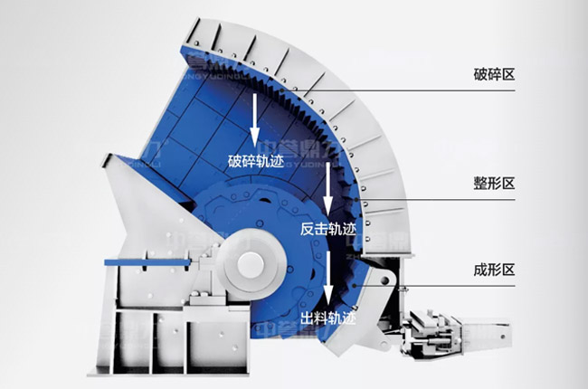 原理詳解:原料由振動給料機送入機腔,錘頭轉子的帶動下高速旋轉,對物料進行一次打擊,物料在錘頭的沖擊作用下被破碎;物料在錘頭的沖擊力下獲得動能,后高速撞向機腔內壁的反擊板,被再次破碎;在整個過程中,物料之間也會形成相互撞擊的力;當物料粒度小于出料口間隙時,自動排出破碎腔。
