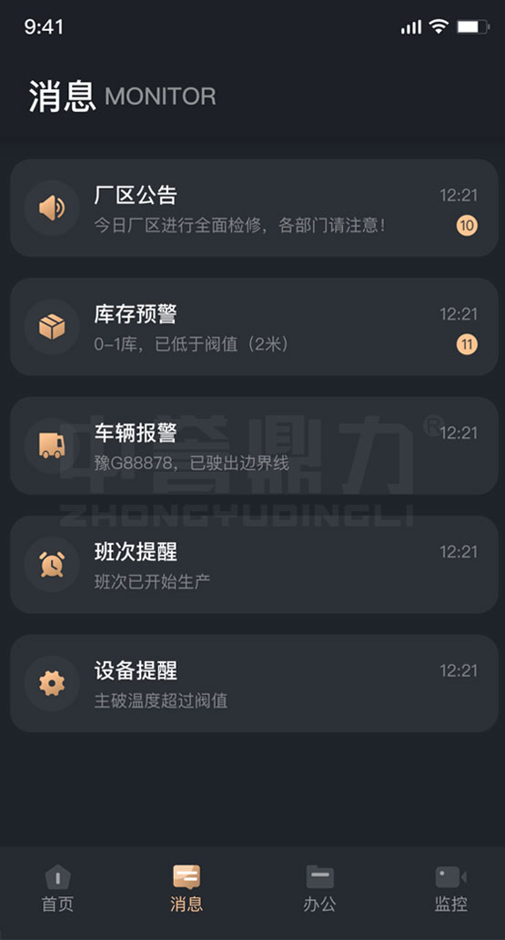 包含廠區公告、庫存預警、車輛報警、班次提醒、設備提醒的消息通知,支持離線通知