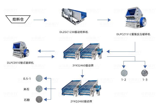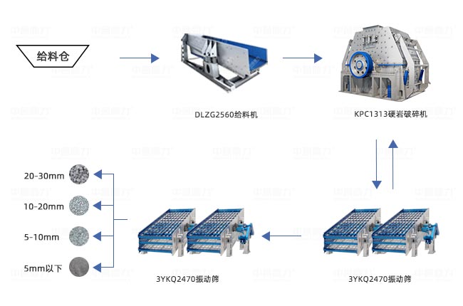 設備配置:DLZGC1250給料機+DLKPC1313硬巖破碎機+DL3YKQ2470振動篩等。