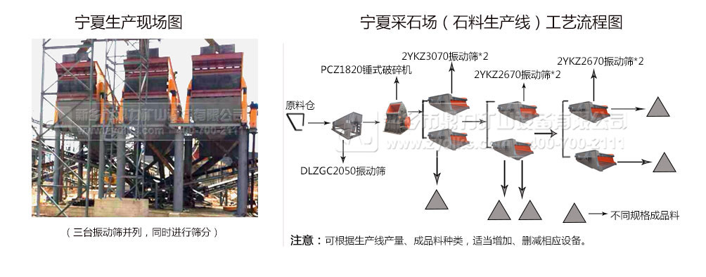 從生產現場圖可以看到,三臺振動篩并駕齊驅,同時進行篩分,可以快速進行破碎物料粒度的篩分,從而形成短時間、率、產量高的大中型砂石骨料生產線。