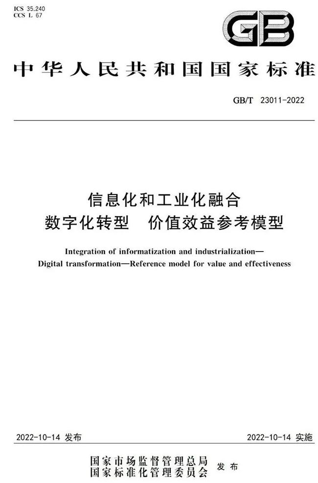 2022年10月,國家市場監督管理總局(國家標準化管理委員會)發布2022年第13號中國國家標準公告,批準《信息化和工業化融合 數字化轉型 價值效益參考模型》(GB/T 23011-2022)正式發布。
