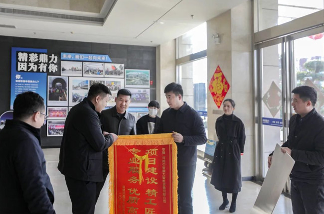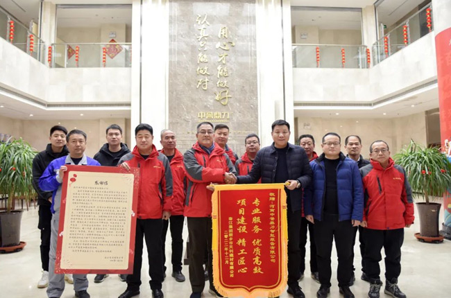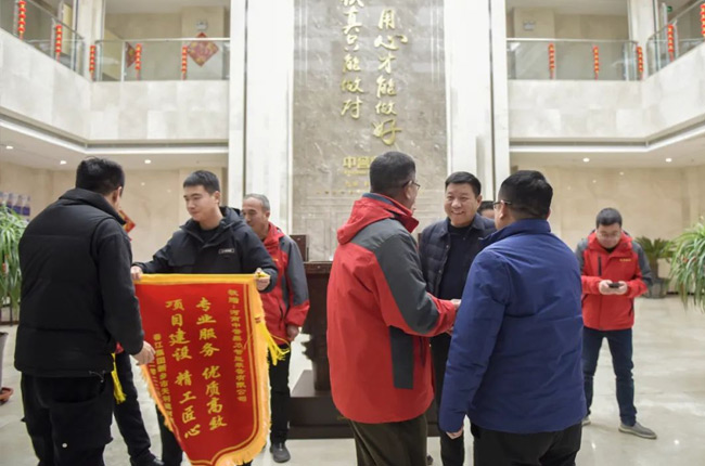 1月16日下午,中譽鼎力總經理楊乾、副總經理陳樹凱、銷售經理趙元勝及項目工程師接收天利建材導送來的感謝信和錦旗,并合影留念。