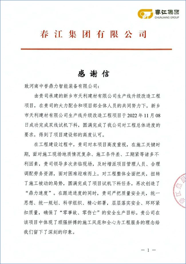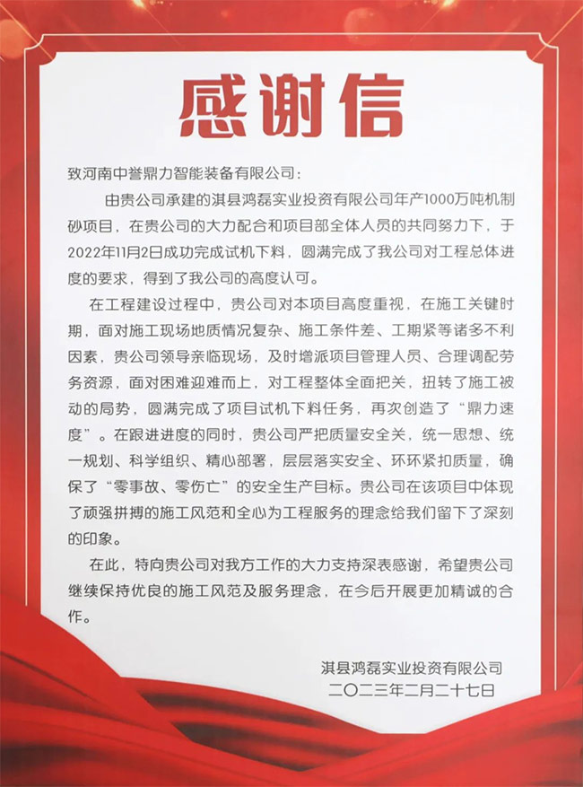 摘要:中譽鼎力連續收到鶴壁鴻磊實業、春江天利建材送來的感謝信和錦旗,這是對中譽鼎力EPC承建項目施工安裝專業度的,今后,中譽鼎力將以榮譽為起點,以責任為基石,繼續秉承“認真只能做對,用心才能做好”的工作理念和“快捷 智慧 運營,打造全生命周期礦山管理新模式”的定位,為客戶提供精工匠心、、誠信、合作共贏的建材項目EPCO總承包服務,創造更多價值!