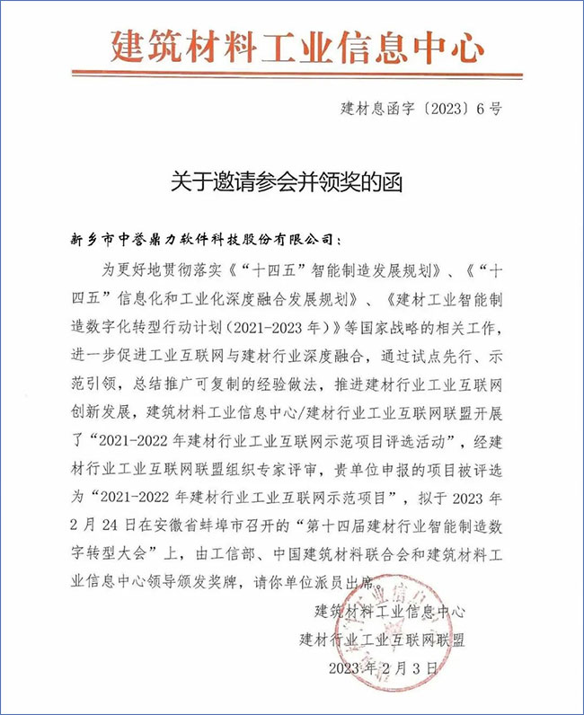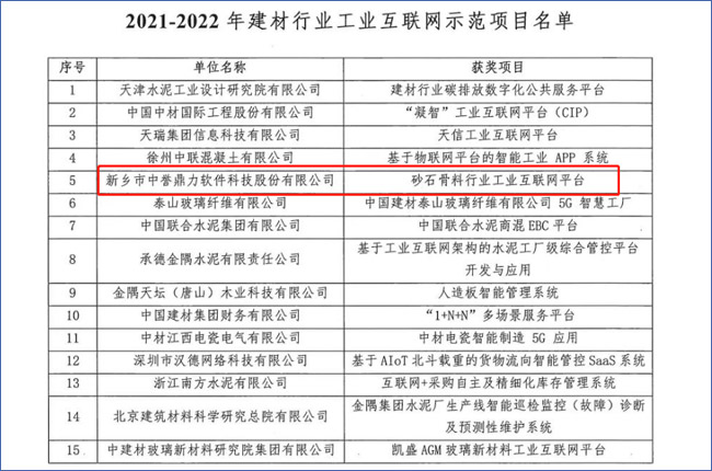 新鄉(xiāng)市中譽(yù)鼎力軟件科技股份有限公司“砂石骨料行業(yè)工業(yè)互聯(lián)網(wǎng)平臺(tái)”項(xiàng)目被評(píng)為“2021-2022年建材行業(yè)工業(yè)互聯(lián)網(wǎng)項(xiàng)目”。
