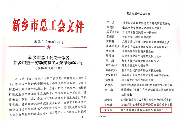 為鼓勵,樹立典型,進一步增強新時代工人階級的自豪感和使命感,大力弘揚勞模精和工匠精,營造勞動光榮的社會風尚和精益求精的敬業(yè)風氣,日前,新鄉(xiāng)市總工會對2019年為市經(jīng)濟社會健康發(fā)展作出重要貢獻的個人和集體進行了表彰。其中,243人榮獲“新鄉(xiāng)市五一勞動獎?wù)?rdquo;,新鄉(xiāng)市鼎力礦山設(shè)備有限公司車間主任李衛(wèi)華獲此殊榮!