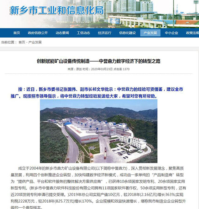 3月19日,新鄉(xiāng)市工信局發(fā)布了一篇題為《創(chuàng)新賦能礦山設(shè)備傳統(tǒng)制造——中譽鼎力數(shù)字經(jīng)濟下的轉(zhuǎn)型之路》的文章。新鄉(xiāng)市委書記張偉、副市長祁文華批示:中譽鼎力的經(jīng)驗可資借鑒,建議市推廣,并詳細介紹了中譽鼎力的轉(zhuǎn)型經(jīng)驗。