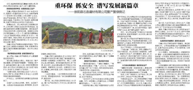 4月底,湖北日報刊文《重環(huán)保 抓安 譜寫發(fā)展新篇章——崇陽縣石鑫建材有限公司復(fù)產(chǎn)復(fù)綠側(cè)記》和湖北電視臺報道《復(fù)工復(fù)產(chǎn)復(fù)綠做表率 崇陽縣石鑫建材再起航》,對中譽鼎力承建咸陽市石鑫建材環(huán)保智能砂石骨料生產(chǎn)線復(fù)工、復(fù)產(chǎn)、復(fù)綠情況進行了方位宣傳。