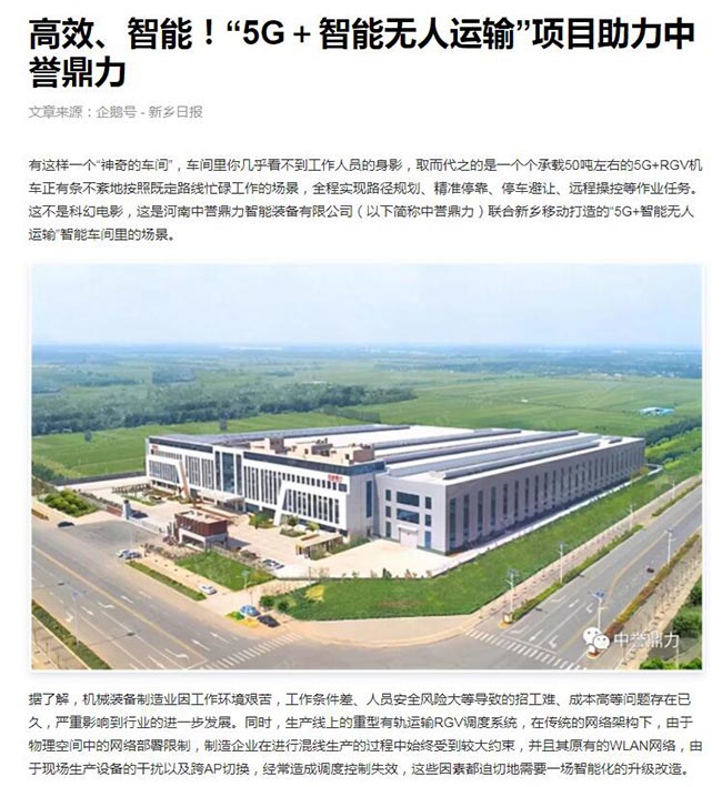 《、智能!“5G+智能無人運輸”項目助力中譽鼎力!》,12月15 日,《新鄉(xiāng)日報》報道公司積打造智能化車間,利用智能管理調(diào)度系統(tǒng)實現(xiàn)遠程實時控制,為中譽鼎力將5G”從理論到應(yīng)用”做出良好的行為點贊。