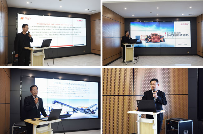 礦山設備新品發布環節,中譽鼎力智能裝備有限公司技術中心陳碧、楊鵬飛、王興乾三位技術工程師,以結構組成分析、性能特點介紹、同類設備對比、動畫視頻演示等多種形式,先后對公司新品DLHGC600臥式旋回破碎機(粗碎)、DLHGC600M臥式旋回破碎機(中細碎)、移動式破碎站、干式制砂樓四款設備進行了詳盡的講解。