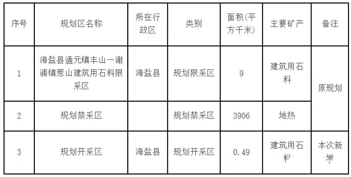 擬在規(guī)劃禁采區(qū)(CJ330400001)內(nèi)新劃定規(guī)劃開采區(qū)一個(gè),并設(shè)置開采規(guī)劃區(qū)塊1個(gè),區(qū)塊內(nèi)設(shè)置“海鹽縣通元鎮(zhèn)聯(lián)新村六里山普通建筑石料礦”采礦權(quán)1宗。