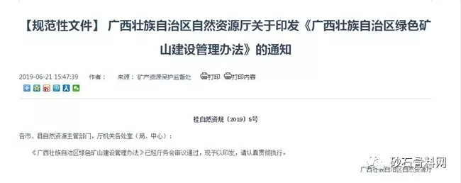 2019年6月17日,廣西壯族自治區自然資源廳印發《廣西壯族自治區綠色礦山建設管理辦法》(簡稱《辦法》),這意味著廣西綠色砂石礦山建設有了詳細的考核。以下內容整理由砂石骨料網整理。