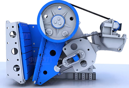 顎式破碎機工作原理簡單,主要通過動靜顎相互擠壓完成物料破碎,皮帶和皮帶輪在電動機驅動下工作,偏心軸帶動動顎上下運動,當動顎向上時,肘板和動顎夾角變大,這時動顎板會靠近固定顎板擠壓物料,達到完成破碎的目的;當動顎向下時,肘板和動顎夾角變小,動顎離開固定顎板,物料下落,從下方排料口排出機腔。
