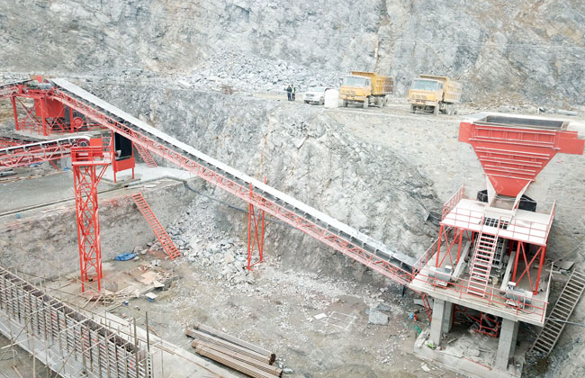 工藝流程:原料經(jīng)料倉(cāng)由ZG1550振動(dòng)給料機(jī)送到重型錘式破碎機(jī)PCZ1615進(jìn)行初步破碎,破碎后的物料被輸送到整形破XPC1622進(jìn)行加工,加工后的物料輸送到一組3YKZ3070并篩進(jìn)行篩分,篩分三種成品料,其中一部分被送到雙轉(zhuǎn)子制砂機(jī)ZSJ1218進(jìn)行細(xì)碎,不滿足成品料粒度要求的被返回整形破進(jìn)行再次加工,其余物料被送到下一組3YKZ3070并篩進(jìn)行篩分,篩分出三種成品料,分別送到成品料倉(cāng)中。