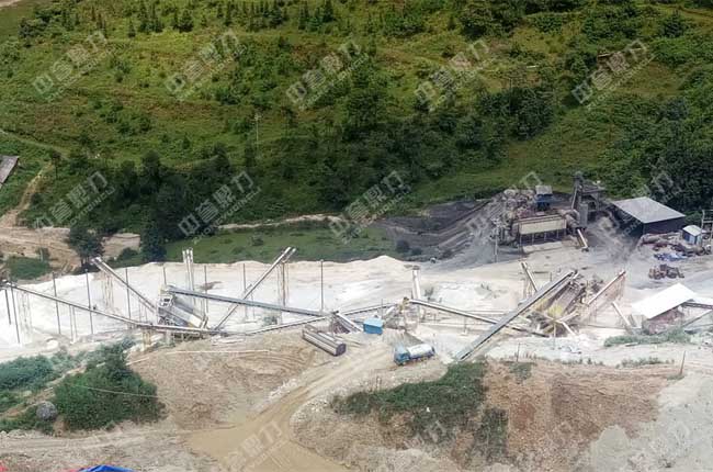 ZG1550振動給料機將大塊物料均勻、連續(xù)的送至一臺PCZ1615重錘式破碎機進行粗碎,粗碎后的物料由一道并篩,也就是兩臺3YKQ2470振動篩進行篩分,篩分出來的大塊物料由皮帶輸送機送到XPC1216錘式破碎機進行進一步破碎,再由皮帶輸送機送至4YKQ2670進行篩分,篩分出1-3、1-2石子、瓜米石和0-5等不同規(guī)格,其中篩分出來的0-5mm的機制砂被送至XS3016輪式洗砂機進行清洗。
