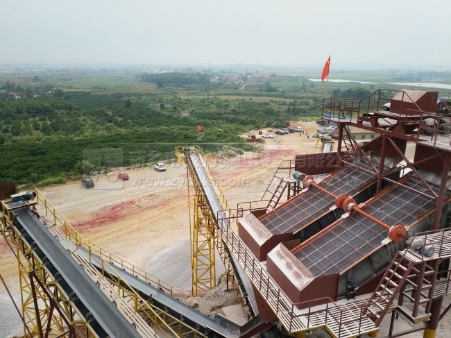 振動(dòng)給料機(jī)+錘式破碎機(jī)+皮帶輸送機(jī)+整形式破碎機(jī)+圓振動(dòng)篩+脈沖袋式除塵器+其他輔助設(shè)備。