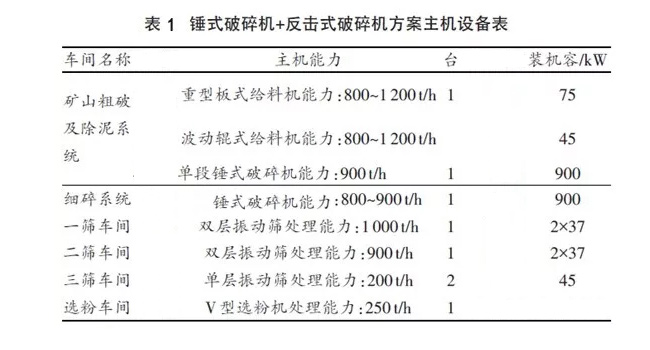 利用自有石灰石礦用配套投建砂石生產(chǎn)線采取的重錘式破碎機(jī)+整形錘式破碎機(jī)的主機(jī)設(shè)備見表1,廠工藝流程見圖2。