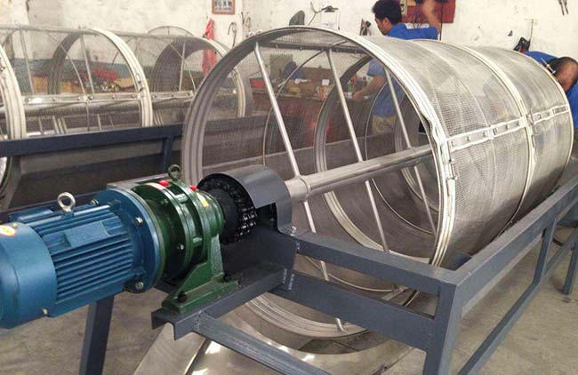 滾筒篩:就是一個圓筒,圓筒外表用一層或多層,或幾段篩網來增加篩分規格,滾筒篩體積一般較大,主要有電機、減速機、滾筒裝置、篩網、機架、密封蓋、進出料口組成,滾筒裝置處會加鋼圈以防滾筒篩變形。