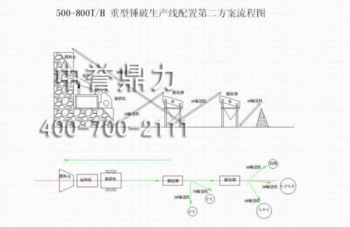 石料進入原料倉,由振動給料機均勻地送到錘式破碎機中進行破碎,破碎后的物料由1號膠帶輸送機送到快速道振動篩上篩分出各種不同規格的石子,其中1-2、1-3規格成品由7號、8號輸送機送出,其他規格的物料再由2號輸送機送到道振動篩上篩分出石粉、0.3-0.6、0.5-1等各規格的物料,分別由4號、5號、6號輸送機送入成品倉,經快速道振動篩過濾出的達不到成品粒度要求的物料則由3號輸送機從快速道振動篩上送返回破碎機重新加工,這樣反復循環。